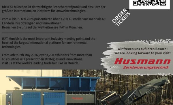 Husmann Zerkleinerungstechnik können Sie hautnah erleben. Wir werden unsere Zerkleinerungstechnik live vorführen auf dem Demogelände. Gegenüber finden Sie unseren Stand F312. Wir freuen uns auf Ihren Besuch!